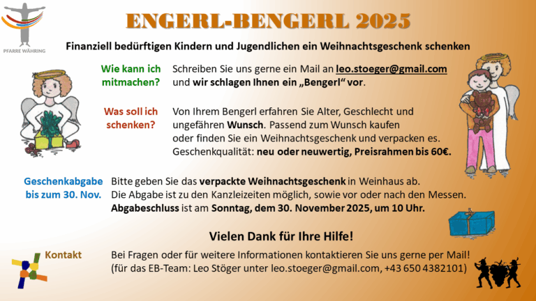 Finanziell bedürftigen Kindern und Jugendlichen ein Weihnachtsgeschenk schenken. Schreiben Sie uns gerne ein Mail an leo.stoeger@gmail.com, Tel. 0650 4382101, und wir schlagen Ihnen ein „Bengerl“ vor. Von Ihrem Bengerl erfahren Sie Alter, Geschlecht und ungefähren Wunsch. Passend zum Wunsch kaufen oder finden Sie ein Weihnachtsgeschenk und verpacken es. Geschenkqualität: neu oder neuwertig, Preisrahmen bis 60€. Bitte geben Sie das verpackte Weihnachtsgeschenk in Weinhaus ab. Die Abgabe ist zu den Sekrektariatszeiten sowie vor oder nach den Messen in der Sakristei möglich. Abgabeschluss ist am Sonntag, dem 30. November 2025 um 10 Uhr.